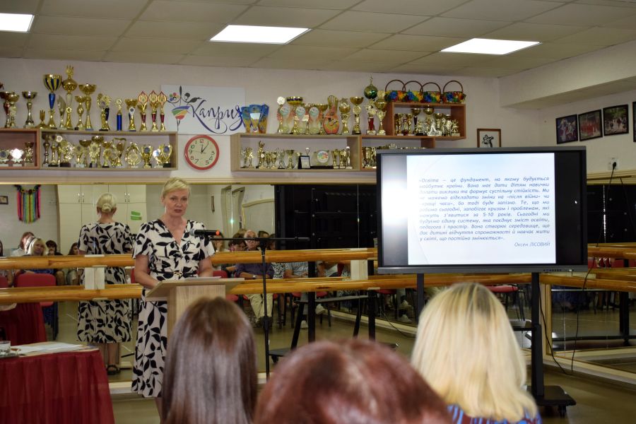 У ході виступу Валентина Павлученко повідомила про низку оновлень у освітньому законодавстві та методичних рекомендаціях, ознайомила з основними документами, які регламентують професійну діяльність педагогів у новому навчальному році. Також керівник закладу вказала на ключові складові освітнього процесу у закладі позашкільної освіти та розкрила їх зміст, а саме: безбар’єрність, національно-патріотичне виховання, професійний розвиток педагогів, психологічний комфорт та ментальне здоров’я учасників освітнього процесу, внутрішня система забезпечення якості освіти, безпечне освітнє середовище.