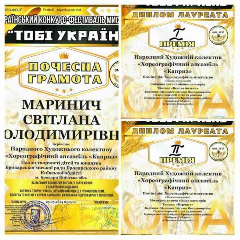 25.05.2024 творчий колектив під керівництвом Світлани Маринич поповнив свою скарбничку перемог, взявши участь у Всеукраїнському конкурсі-фестивалі мистецтв «Тобі Україно», який відбувся у м. Яремче.